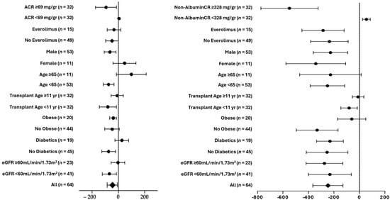 The subgroup analyses in Figure 2 show that the effects on the urinary albumin and non-albumin proteins were similar for males and females, immunosuppressive therapy with or without everolimus, ages ≥ 65 years and ages < 65 years, transplant age > 11 years or ≤11 years, obese and non-obese patients, diabetic and non-diabetic patients, and an eGFR ≥ 60 mL/min/1.73 m2 and < 60 mL/min/1.73 m2. A significant difference was found only for the delta of the non-albumin/creatinine ratio for subjects with a non-albumin/creatinine ratio above or below the median of the cohort.