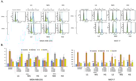 The effects of FEC treatment on cell cycle profiles of MDA-MB-231 and MCF-7 cell lines. (A) MDA-MB-231 and MCF-7 cell lines were subjected to three concentrations of FEC (Low (L), Medium (M), and High (H)), with treatment groups incubated for 24 h (L1, M1, H1) and 48 h (L2, M2, H2). Notably, G2/M and S-phase cell cycle arrests were observed in MDA-MB-231. The MCF-7 cell line underwent G2/M phase cell cycle arrest. (B) Colour-coded representation of cell cycle phases: Sub-G1 (blue), G1 (orange), S (grey), and G2/M (yellow). The mean values of cell cycle phases in the treatment groups were compared with the control group using a paired t-test. Data were presented as the mean ± SD (n = 9). The mean values of the cell cycle phases of treatment groups were compared with the mean values of cell cycle phases of a control group by using a paired t-test; p < 0.05 *, p < 0.01 **, p < 0.001 ***.