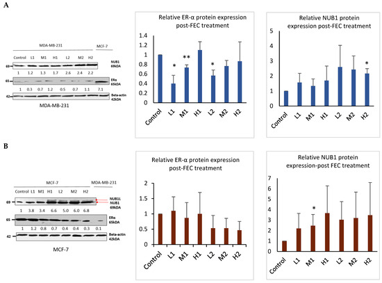 Western blotting analysis confirmed that FEC treatment upregulated NUB1 in both cell lines and decreased ERα protein expression in the ER-positive BC cell line (Figure 2). NUB1 exhibited dose- and time-dependent upregulation in MDA-MB-231 and MCF-7 cell lysates post-FEC treatment (Figure 2A,B). High FEC concentrations for 48 h induced NUB1 expression, also triggering NUBIL (NUB1 long; an isoform of NUB1) expression in MCF-7 cells (Figure 2B). Post-FEC treatment, MCF-7 lysates exhibited a dose- and time-dependent trend toward reduced ERα protein expression, most evident at high dose/48 h, although statistical significance was limited due to biological variability (Figure 2B). In contrast, MDA-MB-231 lysates displayed no functionally meaningful ERα expression (Figure 2A). MDA-MB-231 cells may express very low or trace amounts of ERα that fall below the threshold of functional relevance [28]. Nonetheless, these low levels can still be detected using highly optimised immunoblotting and a sensitive antibody, even though they are clinically insignificant. ERα downregulation in response to NUB1 induction occurs primarily in ER-positive MCF-7 cells.