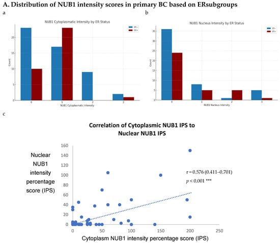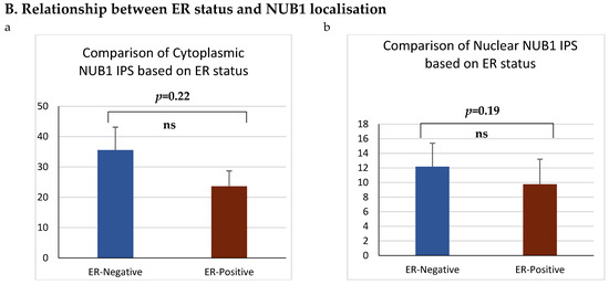 ER status was examined with clinicopathological criteria, revealing a significant association between the nuclear and cytoplasmic NUB1 IPS. We observed a strong, statistically significant relationship between the nuclear NUB1 IPS and cytoplasmic NUB1 IPS (r = 0.57 (0.41–0.70), p = 0.001) (Figure 3A). Cytoplasmic NUB1 levels were significantly higher in ER-negative tumours (mean IPS: 35.5) compared to ER-positive BCs (mean IPS: 23.6) (Figure 3B).