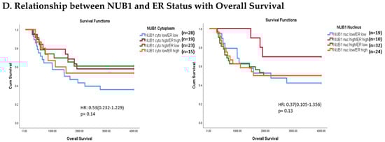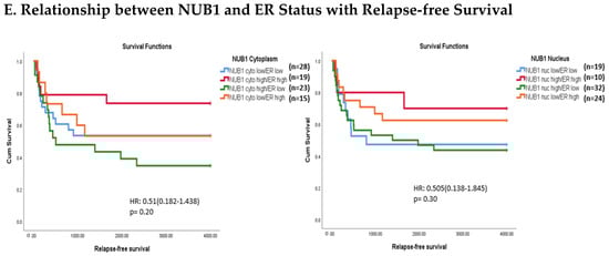 The expression of NUB1 was evaluated by immunohistochemical staining and was correlated with overall patient survival, as determined by a 10-year follow-up. Survival analysis revealed that lower cytoplasmic and nuclear NUB1 expression was associated with poorer OS (HR = 0.61; 95% CI = 0.32–1.11, with non-significant p = 0.10). High NUB1 expression failed to improve RFS (Figure 3C). Subgroup analysis based on ER status indicated that high NUB1 and ER expression led to better OS and RFS at both cytoplasmic (n = 19) and nuclear (n = 10) levels with low hazard ratios (0.53 and 0.37, respectively) and non-significant p values (0.14 and 0.13, respectively) (Figure 3D). The same subgroup with high NUB1 and high ER also seemed to have better RFS at both cytoplasmic (n = 19) and nuclear (n = 10) levels with low hazard ratios (0.51 and 0.50, respectively) and non-significant p values (0.20 and 0.30, respectively) (Figure 3E). These findings (Figure 3D,E) suggest that the concurrent depletion of both NUB1 and ER is associated with reduced OS and an elevated relapse rate in patients with BC.