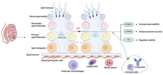Inside the testis, the seminiferous tubules contain spermatogonia and other stages of meiotic cells. Sertoli cells lining these tubules create the BTB by establishing tight junctions between their cytoplasmic extensions, which regulate permeability and help maintain immune privilege. The abbreviations used are as follows: BTB (blood–testis barrier); mTORC1 (Mechanistic Target of Rapamycin Complex 1); mTORC2 (Mechanistic Target of Rapamycin Complex 2); and FAK (Focal Adhesion Kinase).