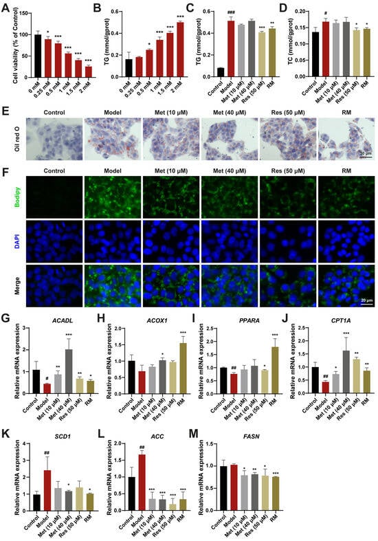 RM ameliorated lipid homeostasis in HepG2 cells treated with FFA. (A) Effects of FFA (0, 0.25, 0.5, 1, 1.5, and 2 mM) on HepG2 cell viability (n = 6). (B) Effects of FFA (0, 0.25, 0.5, 1, 1.5, and 2 mM) on HepG2 cell TG levels (n = 3). (C,D) The levels of TG and TC in HepG2 cells (n = 3). (E,F) Representative images of Oil Red O and Bodipy staining of HepG2 cells (n = 3, scale bar: 30 μm and 20 μm). (G–M) The mRNA levels of HepG2 cells were examined by RT-qPCR (n = 3). Data represent mean ± SD; # p < 0.05, ## p < 0.01, ### p < 0.001 versus the control group; * p < 0.05, ** p < 0.01, and *** p < 0.001 versus the model group.