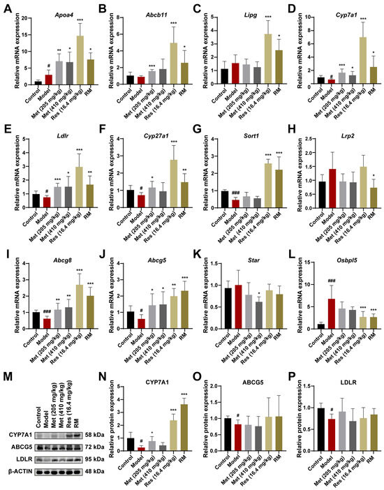 RM upregulates the cholesterol metabolism pathway by synergistically promoting the expression of CYP7A1 to prevent MASH. (A–L) The mRNA levels of DEGs enriched in the cholesterol metabolism pathway in mice liver were measured by RT-qPCR (n = 6). (M–P) The expression levels of CYP7A1, ABCG5, and LDLR in mice liver tissues were detected by Western blot experiment with β-ACTIN as the internal reference (n = 4). Data represent mean ± SD; # p < 0.05, ### p < 0.001 versus the control group; * p < 0.05, ** p < 0.01, and *** p < 0.001 versus the model group.