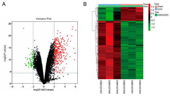 Identification of DEGs from the GSE42303 dataset. (A) The volcano plot visualizes DEGs. Red: up-regulated genes; Green: down-regulated genes (B) The expression profiles of DEGs are shown as the heatmap.