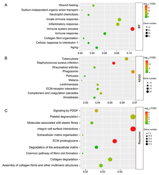 Functional enrichment analyses of DEGs. (A) The top 10 significantly enriched biological processes. (B) The top 10 significantly enriched KEGG pathways. (C) The top 10 significantly enriched Reactome pathways. p-value < 0.05 was set as the threshold.