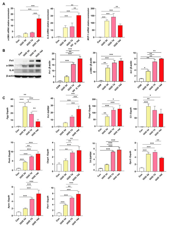 GSE42303, GSE118339, and GSE30528 gene expression profile datasets came from the GEO database at the NCBI (https://www.ncbi.nlm.nih.gov/geo/, accessed on 2 December 2021). The GSE42303 dataset, which is based on the GPL8321 platform (Affymetrix Mouse Genome 430A 2.0 Array; Affymetrix, Santa Clara, CA, USA), contains three Sham samples and three UUO samples. The GSE118339 dataset, based on the GPL19057 platform (Illumina NextSeq 500; Illumina, San Diego, CA, USA), has three Sham and four UUO samples, which were used as an external validation dataset to estimate hub gene expression levels. The GSE30528 dataset is based on the GPL571 platform (Affymetrix Human Genome U133A 2.0 Array; Affymetrix, Santa Clara, CA, USA). It contains nine control samples and thirteen diabetic nephropathy samples, which are used to verify the expression of core genes in diabetic nephropathy models.