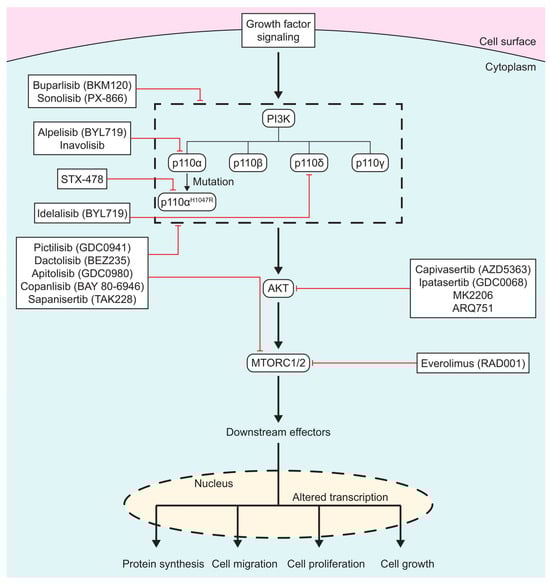 The phosphatidylinositol-3-kinase (PI3K) pathway is frequently mutated in multiple cancers and is a key regulator of important functions such as cell proliferation, cell differentiation, cell survival/apoptosis, and metabolism [1,2,3]. PI3K is part of the lipid kinase family located at the plasma membrane of the cell and is divided into three different classes: class 1, class 2, and class 3 [3]. Class 1 PI3K has two subclasses, denoted as class 1A and class 1B, differentiated by which regulatory isoforms they have [2]. Class 1A has the isoform p85, while class 1B has p101 or p87 [2]. Additionally, class 1A is activated by receptor tyrosine kinases and G-protein-coupled receptors, while class 1B is only activated by G-protein-coupled receptors [4]. Currently, class 1A is the only PI3K subclass associated with tumorigenesis, and thus it will be the focus of this discussion [3].