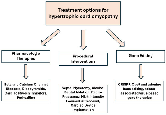 The traditional treatment for hypertrophic cardiomyopathy (HCM) primarily emphasizes the management of symptoms rather than addressing the underlying genetic etiology. Current interventions aimed at symptom reduction include the avoidance of strenuous physical activity, administration of beta blockers and non-dihydropyridine calcium channel blockers, septal myectomy, and, depending on the degree of disease progression, the use of implantable cardioverter-defibrillators to prevent sudden cardiac death. As depicted in Figure 2, these strategies represent the cornerstone of management for patients experiencing symptomatic HCM. However, recent advancements in gene therapy, particularly those related to genomic editing and replacement, have demonstrated potential in targeting the molecular mutations understood to be the pathological foundations of HCM. Researchers have identified two genetic mutations within the cardiomyocytes of patients with HCM—specifically, the sarcomeric genes MYH7 and MYBPC3—which are most frequently associated with the onset of the condition. The MYH7 sarcomeric gene encodes a beta-myosin heavy-chain protein, whereas the MYBPC3 gene is responsible for encoding myosin-binding protein C; both proteins are essential for the proper function and contractility of the heart [54]. These genes are critical for adequate cardiac function and represent significant targets for emerging developments in genetic therapy.