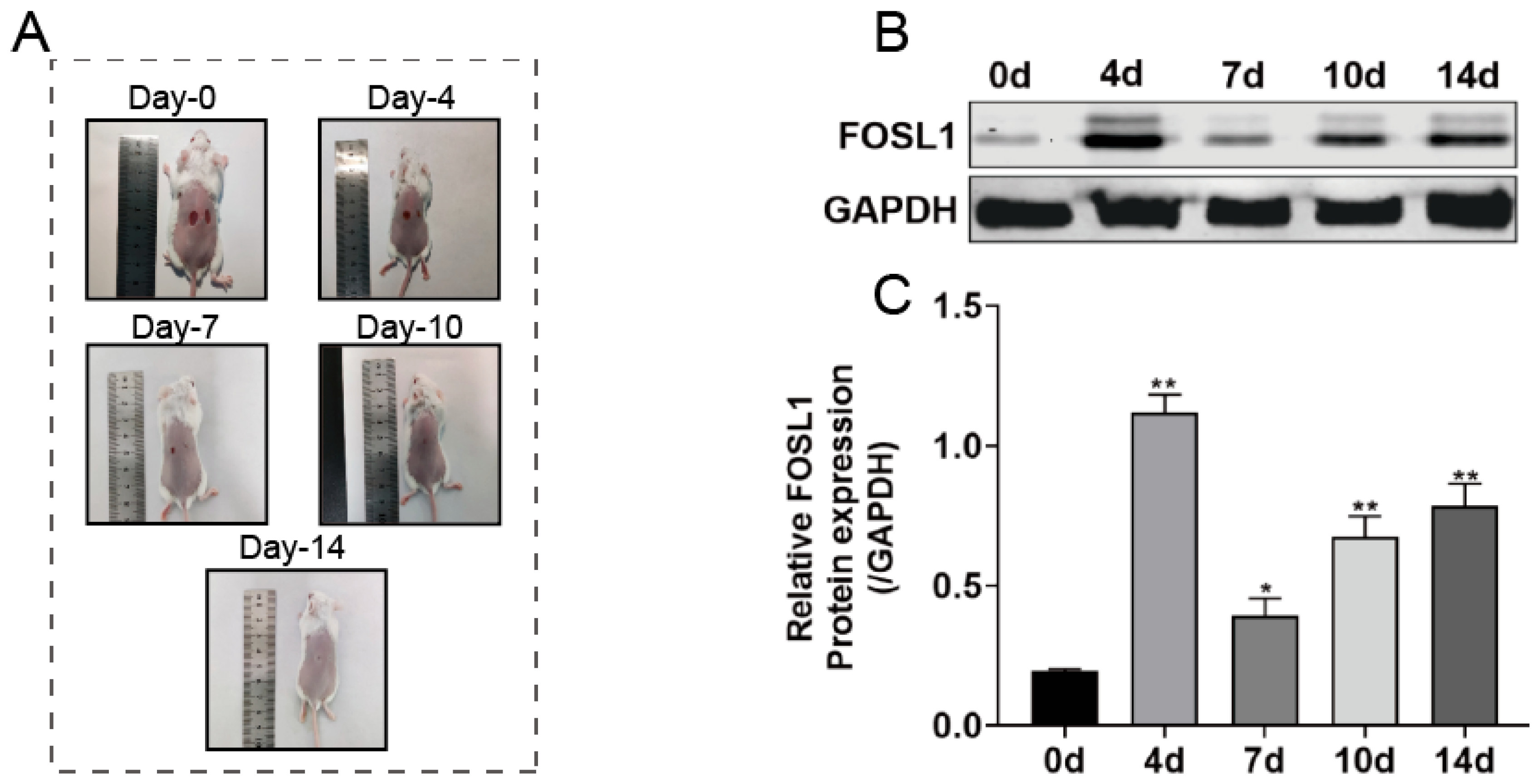 Analysis of FOSL1 expression during wound healing in an animal model. (A) Macroscopic images of cutaneous wound healing in the mouse model. (B,C) Western Blot analysis of FOSL1 expression. * p < 0.05; ** p < 0.01.