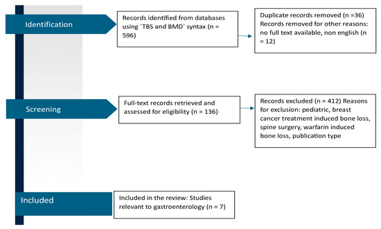 PRISMA flow diagram of the literature search process for studies investigating TBS and BMD in gastroenterology.