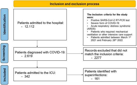 During the monitored period, 12,112 patients were admitted to the hospital, of whom 2619 were diagnosed with COVID-19. Among the COVID-19 patients, 342 (13.0%) were admitted to the ICU; their general characteristics are presented in Table 1. We identified 161 (47.0%) patients with bacterial, fungal, or combined (bacterial and fungal) superinfections not limited to the respiratory tract. Patients in Group I (with superinfections) had a median age of 72 years (IQR: 63.5–79); 78 patients (48%) were male, and 80 (49.6%) resided in rural areas. The median (IQR) APACHE II score at admission was 22.3 ± 6.3, and the median (IQR) SOFA score was 10 (8–11). A flowchart of patient inclusion is presented in Figure 1.