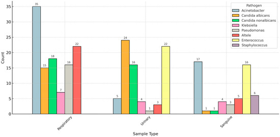 We analyzed the distribution of pathogen species based on the sample type used to diagnose the superinfection. Acinetobacter species was the most common bacterial pathogen in respiratory and bloodstream superinfections. In contrast, Candida (albicans and non-albicans) was the most prevalent fungal infection in respiratory and urinary samples (Figure 2).