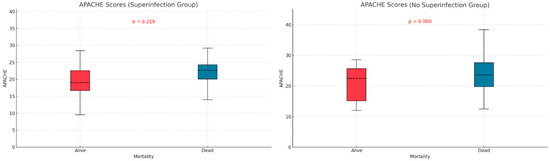 We examined the relationship between mortality and potential contributing variables by comparing APACHE II and SOFA scores in the two subgroups defined by superinfection status. The APACHE II score was significantly higher in non-survivors without superinfections (p < 0.001), but no significant difference was observed in the superinfection group (Figure 3). For SOFA scores, both groups—with or without superinfection—had significantly higher scores among non-survivors (p < 0.001, p < 0.013) (Figure 4).