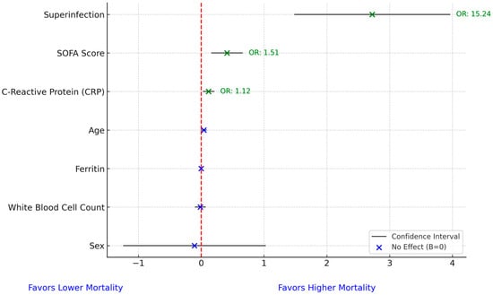 Binary logistic regression was used to develop a model for predicting mortality in patients with superinfections. The model’s predictive capacity was assessed using IBM SPSS 26 with a cutoff value of 0.5, and its goodness of fit was validated using the Hosmer–Lemeshow test.