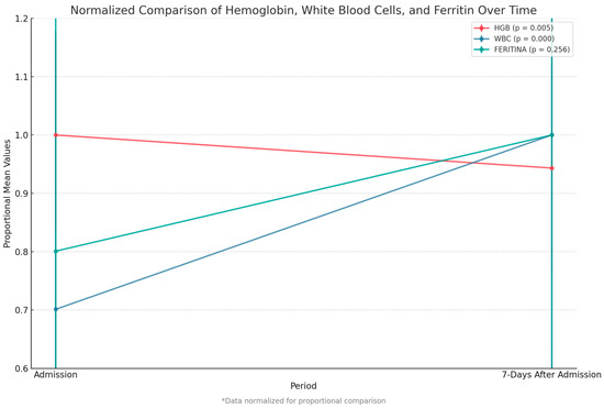 The ferritin levels at admission were significantly different among groups (p = 0.02), with a significant post hoc difference between Groups IA and IC.