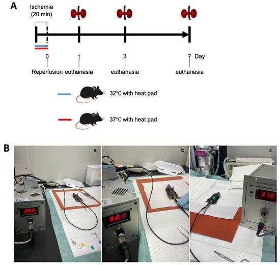 The procedure to induce renal IRI was conducted as previously detailed. In short, mice received anesthesia through an intraperitoneal injection containing a mixture of ketamine (60 mg/kg body weight) and xylazine (8 mg/kg body weight). A surgical incision was made in the abdomen, and bilateral renal pedicles were gently clamped to restrict blood flow. During surgery, the body temperatures of the mice were maintained precisely at either 32 °C or 37 °C, respectively. To maintain the target consistent core temperature during surgery, mice were housed in a specific pathogen-free experimental facility (Preclinical Rodent Facility of Chungam National University Hospital, room temperature 23 ± 1 °C). Under anesthesia, abdominal incisions were made to expose the renal pedicles. The animals were assigned to either the hypothermic or normothermic group. Mice were placed on a heating pad system equipped with a digital temperature controller and connected to a heating pad (FHC, Bowdoin, ME, USA; Cat# FHC 40-90-2). Rectal temperature was continuously monitored using a Mini Rectal Thermistor Probe (FHC, Bowdoin, ME, USA; Cat# FHC 40-90-5D-02) and automatically regulated with a DC Temperature Controller (FHC, Bowdoin, ME, USA; Cat# FHC 40-90-8D). This setup successfully maintained the mice’s rectal temperatures at 37 ± 1 °C and 32 ± 1 °C, respectively. In the hypothermic group, the core temperature was maintained at 32 ± 1 °C within five minutes of positioning the animal on the pad. Once the target temperature was reached, ischemia was induced by clamping both renal pedicles with microvascular clips for 20 min, after which the clips were removed to allow for reperfusion. In the normothermic group, body temperature was stabilized at 37 ± 1 °C under the same surgical and temperature control conditions. The ischemia and reperfusion procedure was conducted identically to that in the hypothermic group (Figure 1B).