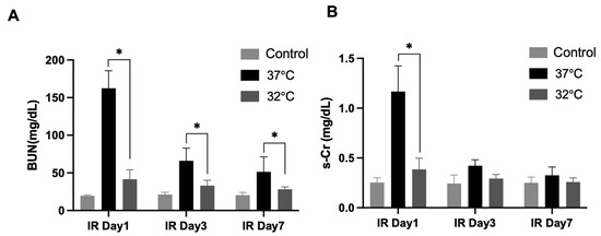 The effects of hypothermia on renal function with renal IR mice. Blood urea nitrogen (BUN) and serum creatinine (s-Cr) levels evaluated for renal function in the 37 °C group and 32 °C group, respectively, on days 1, 3, and 7 compared to control mice. n = 4–6 per group. (A) BUN levels were elevated in the 37 °C IRI group on days 1, 3, and 7 compared to controls, but significantly reduced in the 32 °C group at all time points relative to the 37 °C group (Figure 2A). (B) s-Cr levels peaked in the 37 °C group on day 1, while the 32 °C group showed lower levels than the 37 °C group at the same time point. The bars represent means ± SD. * p < 0.05.