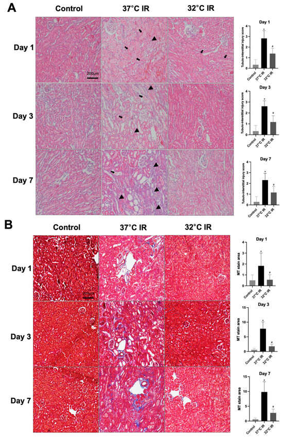 Hypothermic effect on renal histology. (A) Representative H and E stain of kidney section. Black arrows represent cell debris and tubular necrosis. Black arrowheads represent inflammatory cells. Original magnification, 200×. (B) Representative Masson’s trichrome stain of kidney section. Original magnification, 200×. * p < 0.05 vs. control group, # p < 0.05 vs. 37 °C IRI group. The bars represent means ± SD.