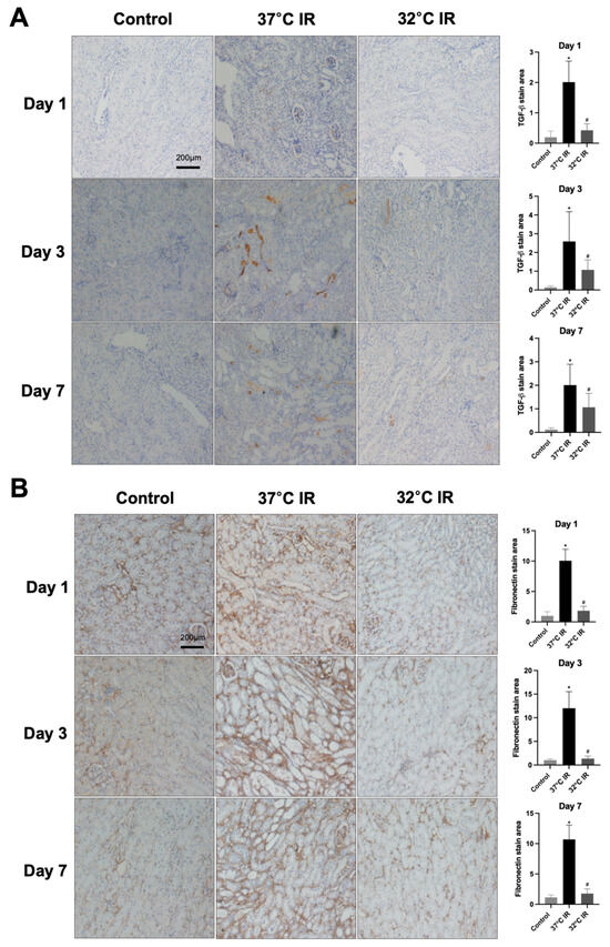Histological analysis using H and E staining revealed significantly increased renal injury scores, including renal tubular cell atrophy, interstitial inflammation, and tubulointerstitial fibrosis, in the 37 °C IRI group compared to the control group. However, these injury scores were significantly lower in the hypothermic 32 °C IRI group (Figure 3A). Similarly, Masson’s trichrome staining indicated a significantly larger fibrotic area in the 37 °C IRI group compared to the control group, which was notably reduced in the hypothermic 32 °C IRI group (Figure 3B). Immunohistochemistry demonstrated significantly increased staining for TGF-β1, fibronectin, collagen IV, and α-SMA in the 37 °C IRI group compared to the control group’s kidneys (Figure 4A–D). These fibrotic markers were significantly decreased in all hypothermic 32 °C IRI groups at each measured time point (day 1, day 3, and day 7). Western blot analysis was performed to quantitatively evaluate fibrotic markers, including TGF-β1 and α-SMA in kidney tissues (Figure 5). The protein levels of TGF-β1 and α-SMA were significantly higher in the 37 °C IRI group on day 1, day 3, and day 7 than in the control group. However, these markers were significantly reduced in the 32 °C IRI group compared to the 37 °C IRI group on day 1, day 3, and day 7 (Figure 5). Collectively, these results suggest that hypothermia significantly attenuates renal fibrosis following IRI in mouse kidneys.
