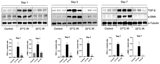 Representative images of Western blot and quantitative analysis of renal fibrosis markers. The protein levels of TGF-β1 and α-SMA in the kidney tissues of each experimental group were evaluated using Western blot. * p < 0.05 vs. control group, # p < 0.05 vs. 37 °C IR group. The bars represent means ± SD.