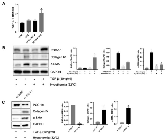 The protective role of hypothermia on renal fibrosis and PGC-1α in vitro. (A) The mRNA expression of PGC-1α; * p < 0.05 vs. 37 °C + TGF-β group. (B) Protein expression levels of PGC-1α, collagen IV, and α-SMA in TGF-β-treated HK-2 cells under hypothermic (32 °C) and normothermic conditions (37 °C); * p < 0.05 vs. 37 °C without TGF-β group, # p < 0.05 vs. 37 °C with TGF-β group. (C) Protein expression levels of α-SMA and collagen IV under TGF-β-treated hypothermic conditions (32 °C) in HK-2 cells with or without knockdown of PGC-1α; # p < 0.05 vs. scCONT group. The bars represent means ± SD.