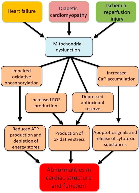 In view of the importance of mitochondria in normal cell function, this narrative review intends to describe the role of defects in mitochondrial energy generation, increased ROS production, dysregulation of cardiomyocyte Ca2+-handling, and mitochondrial Ca2+-overload, as well as cell apoptosis in cardiac dysfunction in different pathophysiological conditions such as heart failure, diabetic cardiomyopathy, and ischemia–reperfusion injury. Accordingly, the appropriate literature was searched on MEDLINE via PubMed by using the following search terms: mitochondrial dysfunction, cardiac ischemia–reperfusion injury, diabetic cardiomyopathy, heart failure, reactive oxygen species, oxidative stress, Ca2+-handling, and intracellular Ca2+-overload, and combinations thereof, and the articles cited in this review were those selected to provide support of our hypothesis.
