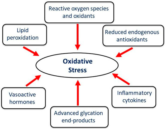 Oxidative stress represents a state of redox disequilibrium characterized by the excessive generation of ROS, including superoxide anion radicals, hydrogen peroxide, and hydroxyl radicals, alongside a concurrent reduction in endogenous antioxidant capacity [42]. It should be mentioned that the hydroxyl radicals are considered the most powerful among the ROS [43]. The accumulation of mitochondrial ROS accompanied by a variety of different factors, including heightened inflammatory response, formation of advanced glycation end-products, and lipid peroxidation, all collectively exacerbate oxidative stress (Figure 3).
