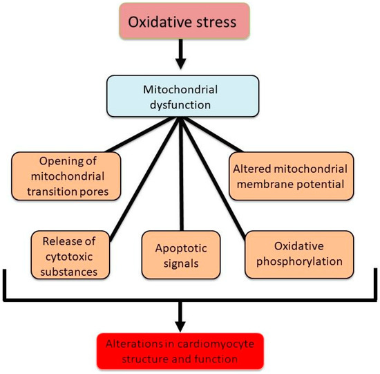 Mitochondrial abnormalities due to oxidative stress, leading to changes in cardiac function and structure.