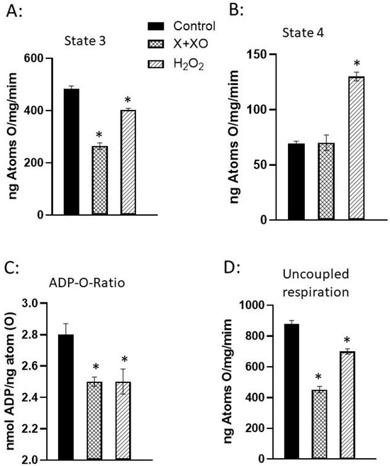 Mitochondrial respiration and oxidative phosphorylation activities of rat hearts perfused with xanthine + xanthine oxidase or H2O2. Hearts were perfused with 2 mM X and 60 mU/mL XO or with 100 µM H2O2 for 30 min. (A):State 3 respiration; (B) State 4 respiration; (C) ADP to oxygen ratio and (D) Uncoupled respiration. Data are taken from our paper [78]. Values are mean ± SE of 3 experiments. * = p < 0.05. Abbreviations: X = xanthine; XO = xanthine oxidase; H2O2 = hydrogen peroxide.