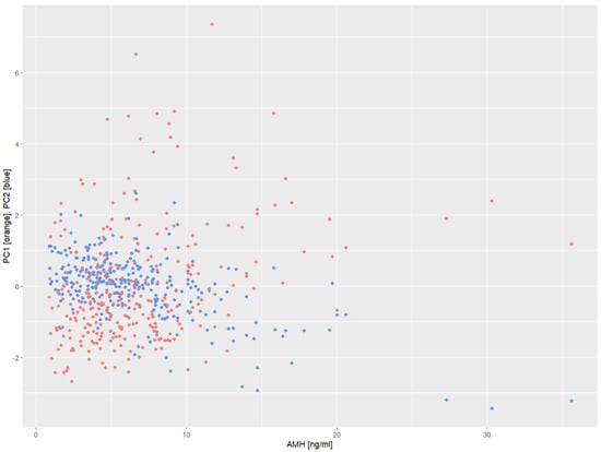 Due to strong correlations between hormone concentrations (Figure 1), it was decided to perform a factor analysis using the principal components method. The principal components analysis isolated two factors, with summing explaining 83.95% of the variance of the system. Factor 1 explained 65.42%, while factor 2 explained 18.53%. It was observed that factor 1 was positively correlated with all components of the analysis (PC1 with free testosterone, total testosterone, androstenedione, and DHEA-S consequently 0.511; 0.565; 0.442; 0.473), while factor 2 was strongly negatively correlated with androstenedione (PC2 = −0.763) concentration and positively with DHEA-S (PC2 = 0.587). Its correlations with testosterone were weak (free testosterone PC2 = 0.244, total testosterone −0.115). AMH appears to be positively associated with androgen hormones. Androstenedione appears to have a clear effect on the increase in AMH concentration, while an increase in DHEA-S contributes to a decrease in AMH concentration, which was not observed in simple univariate analyses (Figure 2).