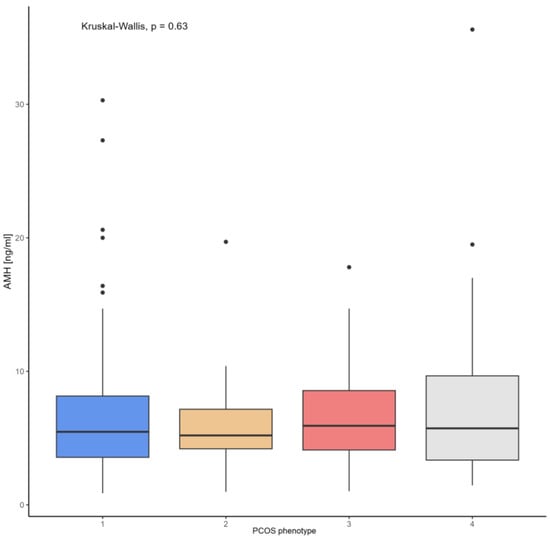 According to the Kruskal–Wallis test, there were no significant differences between AMH concentration and the four PCOS phenotypes (Figure 3), nor when PCOS was divided into hyper- and normoandrogenic phenotypes (Figure 4).