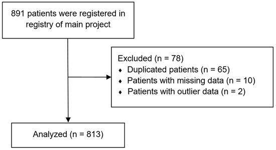 A total of 891 patients were enrolled in the registry of the main project, and 78 patients with missing or duplicate data were excluded. The final analysis included 813 patients. The patient selection flowchart is summarized in Figure 1.