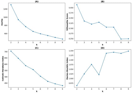 Dependence of internal validation metrics on the number of clusters (k) in K-means clustering. (A) Inertia (Elbow method); (B) Silhouette Score; (C) Calinski–Harabasz Index; (D) Davies–Bouldin Index. Better clustering is indicated by higher values in the Silhouette Score and Calinski–Harabasz Index, whereas lower values are preferable for the Davies–Bouldin Index. The Elbow method identifies an inflection point in intra-cluster inertia. These metrics were used collectively to determine the optimal number of clusters.