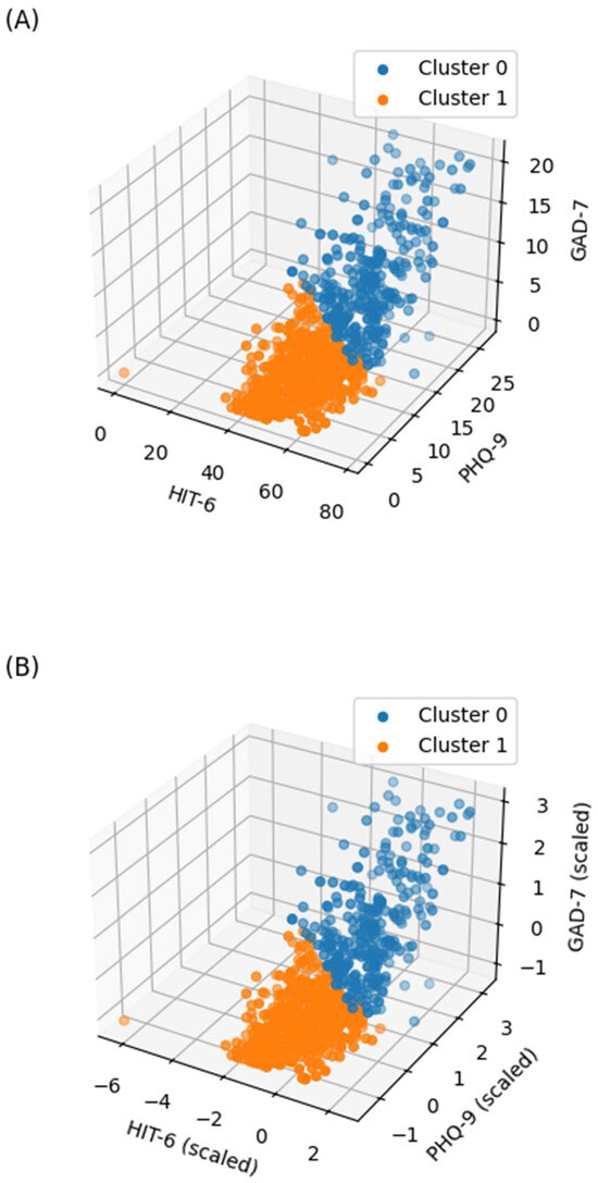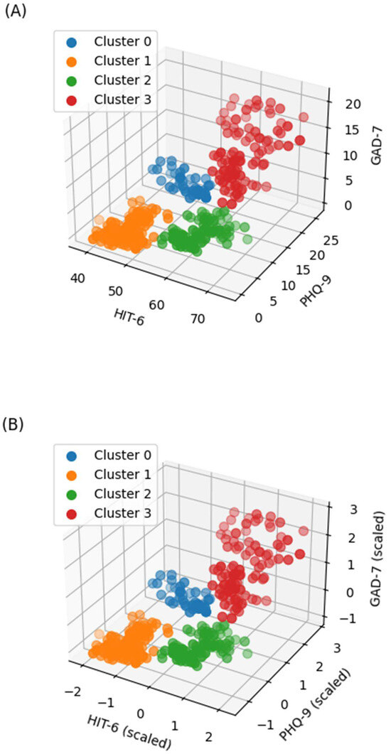 Distribution of HIT-6, PHQ-9, and GAD-7 scores based on K-means clustering. (A) Cluster distribution for raw data (based on scaled K-means); (B) cluster distribution for scaled data (same labels). HIT-6, Headache Impact Test-6; PHQ-9, Patient Health Questionnaire-9; GAD-7, Generalized Anxiety Disorder 7-Item Scale.