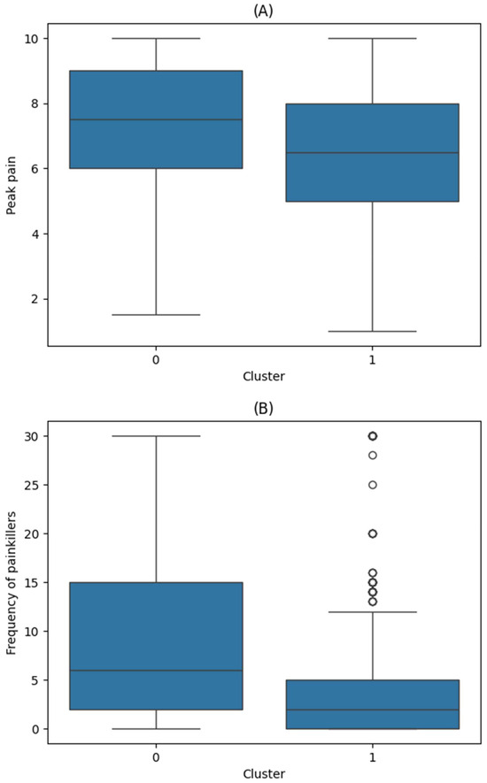 Distribution of primary outcomes by K-means cluster. (A) Peak pain intensity (mean; Cluster 0: 7.3; Cluster 1: 6.3; p < 0.001). (B) Frequency of painkiller use (mean; Cluster 0: 9.7; Cluster 1: 4.4; p < 0.001). Values are visualized using boxplots; p-values are from independent t-tests.