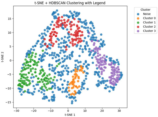 Distribution of clusters identified via HDBSCAN after dimensionality reduction using t-SNE. HDBSCAN, hierarchical density-based spatial clustering of applications with noise; t-SNE, t-distributed stochastic neighbor embedding.