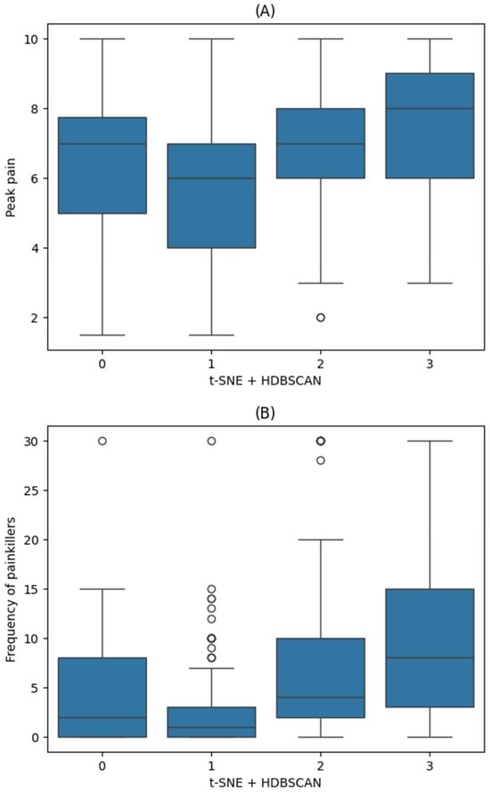 The distributions of HIT-6, PHQ-9, and GAD-7 across the HDBSCAN clusters are illustrated in Figure 6 and Figure A2 (Appendix A). Both peak pain intensity and painkiller use demonstrated significant differences among the clusters (p < 0.001 for both; Figure 7).
