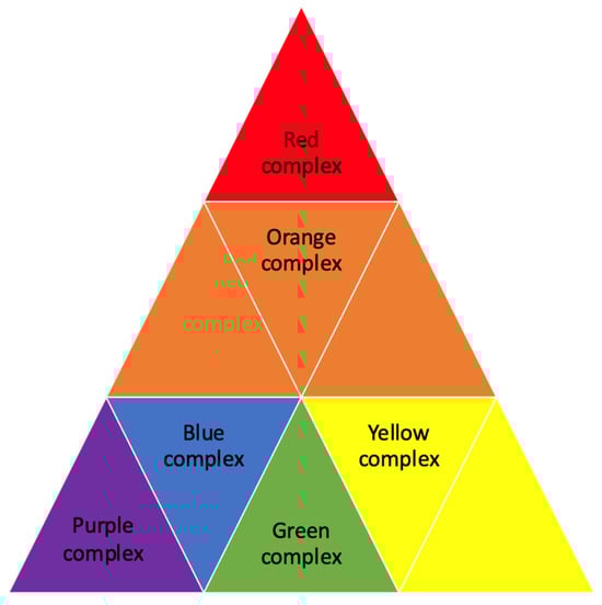 Some of the bacterial species associated with periodontitis are involved in the pathogenesis of systemic diseases. Periodontal pathogenic bacteria are organized into complexes that are interconnected according to their pathogenicity, as shown in Figure 1. Bacteria of the green, blue, purple, and yellow complexes are called early colonizers because they have the ability to adhere to the pellicle. These bacteria are facultative anaerobes or aerobes, which enables them to survive in oxygen-rich environments and provide a substratum for the subsequent adhesion of bacteria from the orange and red complexes, which are essential for the development of biofilms. The orange complex comprises pathogenic bacterial species, with Fusobacterium nucleatum serving as a key representative that colonizes following the initial, early colonizers. Orange complex bacteria are classified as moderately pathogenic and form the basis for colonization by other pathogens. Highly pathogenic bacteria of the red complex, which include: Porphyromonas gingivalis, Treponema denticola, and Tannerella forsythia, are the most important causative agents of periodontitis. The presence of red complex bacteria and Aggregatibacter actinomycetemcomitans represents the final stage of colonization [20,21]. P. gingivalis shows the ability to interact with the host’s immune response by secreting proteolytic enzymes, which interfere with the immune signal and improve their survival in the periodontal pocket [22,23].
