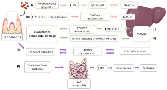 Periodontitis and MASLD interrelation. (a) Bacterial lipopolysaccharides (LPSs) activate NF-kappaB (NF-κB) and Jun N-terminal kinase (JNK) pathways and increase hepatocyte lipid accumulation. (b) Periodontitis triggers systemic inflammation via cytokines (tumor necrosis factor alpha (TNF-α), interleukin 6 (IL-6), interleukin 1 beta (IL-1β)) and microRNA 21 (miRNA-21), which may exacerbate MASLD. (c) MASLD releases pro-inflammatory cytokines (TNF-α, IL-6) and exacerbates periodontal damage. (d) MASLD worsens periodontitis through metabolic dysfunction. (e) T-helper 17 (TH17) and regulatory T cells (Treg) imbalance aggravates periodontal and hepatic inflammation. (f) Oral–gut–liver axis: bacterial translocation increases intestinal permeability (leaky gut) that leads to endotoxemia and promotes hepatic steatosis. Orange arrows represent periodontitis—MASLD interrelations, green arrows represent MASLD–periodontitis interrelations, and purple arrows represent bidirectional relationship and oral-gut-liver axis. Figure created with Servier Medical Art, https://smart.servier.com/ (accessed on: 20 May 2025) and with https://www.vecteezy.com/ (accessed on: 21 May 2025).