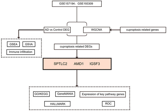 Study flowchart. Utilizing whole-genome data for AD from the GEO database (GSE157194 and GSE193309 were merged for all subsequent analyses), we conducted differential analysis and applied WGCNA to identify differentially expressed genes associated with cuproptosis (Cu-DEGs). This was followed by an integration of GO/KEGG enrichment analysis, gene interaction network construction, and validation of key pathways associated with hallmark features, ROC curve evaluation, GSEA/GSVA analysis, and immune infiltration profiling. Through this comprehensive approach, we systematically untangled the regulatory mechanisms of Cu-DEGs in AD and assessed their diagnostic potential.