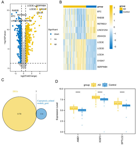 In the transcriptomic analysis comparing AD samples to controls, researchers discovered a total of 1173 differentially expressed transcripts, including 665 up-regulated and 508 down-regulated mRNAs (Supplementary Table S2). All DEGs are shown in volcanic maps (Figure 3A), and a heatmap displays top genes (LCE3E, LCE3D, LCE3A, S100A7, SERPINB4BTC, RAB3B, RETREG1, LINC01254, ZDHHC9) (Figure 3B). Subsequently, we intersected these DEGs with the 117 genes from the greenyellow module, ultimately obtaining three genes (SPTLC2, AMD1, and IGSF3) (Figure 3C). These three genes were identified as hub genes for further investigation and exhibit significant differences in expression between groups in boxplots p < 0.05, Figure 3D.