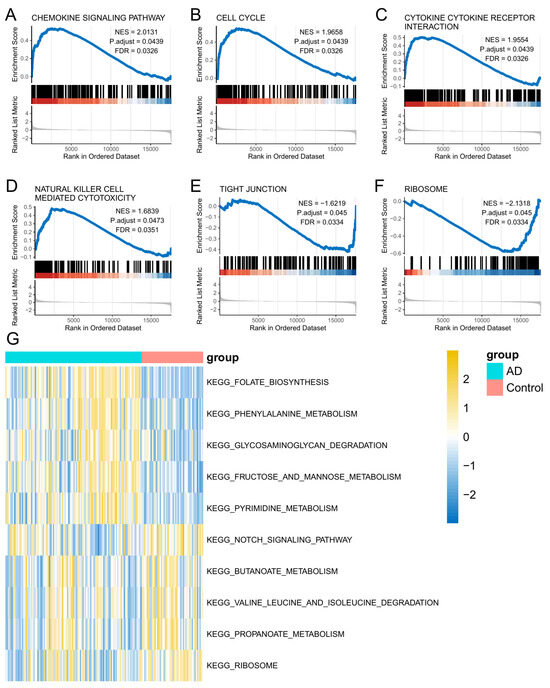 Pathways significantly enriched for AD genes. Red bars show atopic dermatitis samples, while blue bars indicate healthy controls, reflecting differential gene enrichment in pathways. (A) Chemokine signaling pathway. (B) Cell cycle. (C) Cytokine–receptor interaction. (D) NK cell-mediated cytotoxicity. (E) Tight junction. (F) Ribosome. (G) Visualize GSVA with heat maps.