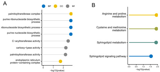 Functional enrichment of cuproptosis-linked differentially expressed genes. (A) GO enrichment entries, shown with a lollipop chart. The colors represent different categories: blue for Biological Process (BP), yellow for Cellular Component (CC), and gray for Molecular Function (MF). (B) The KEGG enrichment pathway, shown with a lollipop diagram.