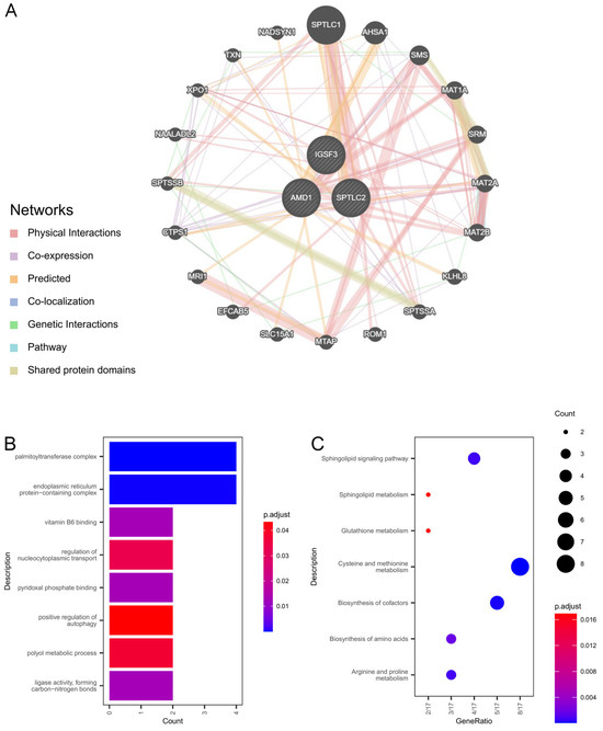 Integrated network analysis of central molecular regulators was identified via three interconnected regulatory hubs through GeneMANIA-derived PPI mapping (Figure 6A), with subsequent multi-omics profiling of 23 coordinated targets revealing functional specialization in nucleocytoplasmic transport regulation (GO:0046822), polyol catabolic regulation (GO:0019751), autophagy activation (GO:0010508), palmitoylation complexes (GO:0002178), and pyridoxal phosphate/vitamin B6-mediated catalysis (GO:0030170, GO:0070279), as detailed in Figure 6B and Supplementary Table S4. Pathway enrichment demonstrated critical involvement in sulfur-amino acid homeostasis (hsa00270), sphingolipid signaling (hsa04071), and redox metabolism (hsa00480), comprehensively visualized in Figure 6C and Supplementary Table S5.