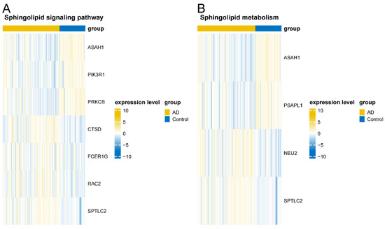 Sphingolipid signaling pathway in AD and control samples. (A) Sphingolipid metabolism. (B) Key gene expression heatmap.