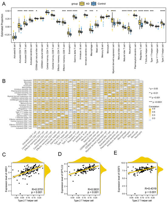 Difference in immune infiltration in AD. (A) Leukocyte infiltration quantification. (B) Correlation between immune cells. The scatter plots illustrate the correlations between AMD1 (C), SPTLC2 (D), GSF3 (E), and Type 2 T helper cells. The solid line represents the linear regression fit, while the shaded area corresponds to the 95% confidence interval. The asterisks indicate the p-values: **** p < 0.0001, *** p < 0.001, ** p < 0.01, * p < 0.05).