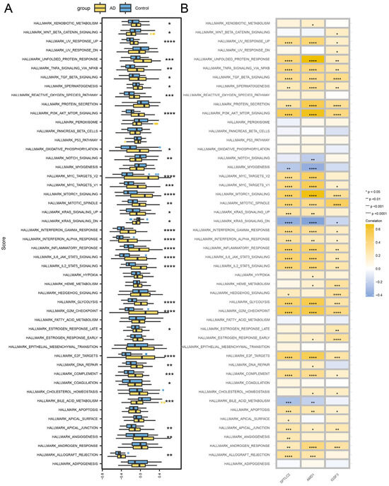 Hub gene–hallmark pathway interactions. (A) AD and control group comparison. (B) Hub gene correlation. **** p < 0.0001, *** p < 0.001, ** p < 0.01, * p < 0.05.