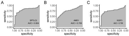 ROC curve for hub gene. (A) SPTLC2. (B) AMD1. (C) IGSF3.