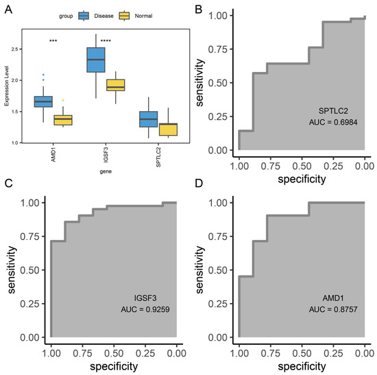 Validation of hub genes in the external independent dataset GSE232127. (A) Expression boxplots of the three hub genes between the disease and control groups in GSE232127. ROC curve of the hub gene SPTLC2 (B), AMD1 (C), and IGSF3 (D) in the external dataset GSE232127. **** p < 0.0001, *** p < 0.001.